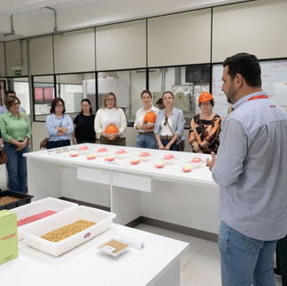 Na sequência, o grupo visitou a Unidade de Beneficiamento de Sementes, onde a gerente Marcela Schiochet evidenciou os processos que vão da multiplicação ao tratamento industrial, garantindo sementes que atendem aos padrões exigidos e proporcionam eficiência e produtividade no campo. O difusor de multiplicação de sementes, Rodrigo Feron, conduziu um tour pelas instalações, encerrando no Laboratório de Sementes.